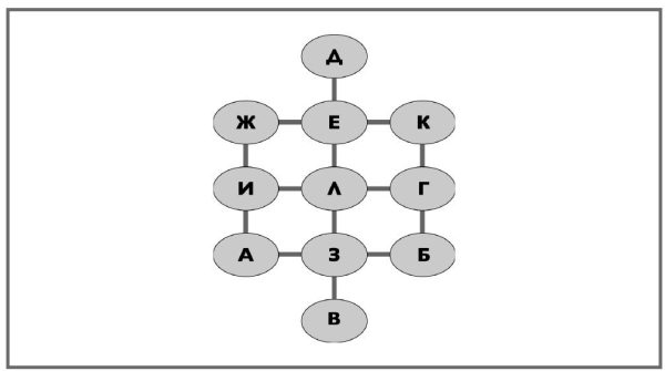 Пропущена буква P: «стоимость» буквы в центральной клетке равна половине суммы «стоимости» букв в остальных клетках (А = 1; В = 2 и т. д.). Таким образом, пропущенная сумма равна 16, а пропущенная буква – Р.