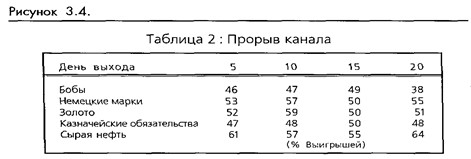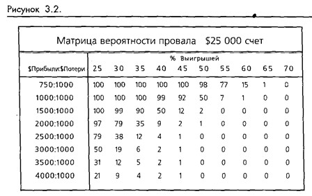 POR базируется на той идее, что в любой торговой системе события возникают регулярно и могут возникать ненормальные события, но все они подчиняются теории вероятности. Например, монетка, подбрасываемая бесконечное количество раз, будет иметь отношение выпадений орел/решка 1:1, но примерно в одном из 1024 случаев орлел будет выпадать 10 раз подряд. Любая торговая система, таким образом, живет с вероятностью того, что независимо от изменения рыночных условий, она будет до некоторой степени саморазрушающейся. POR – это вероятность такого самоуничтожения. Уровень, до которого мы можем контролировать процент выигрышей и отношение выигрыша к проигрышу, диктует степень контроля, которым мы обладаем над нашей торговой системой. Мы не имеем возможности контролировать рыночные условия, но мы, по крайней мере, будем уверены, что наша торговая система не будет самоуничтожаться по собственному разумению. Существует несколько способов вычисления вероятности провала (или риска провала). Мы будем использовать простейшую формулу, которую можно найти в работе П. Гриффина "TheTheory of Blackjack". Следующая таблица показывает репрезентативное множество значений процентов выигрышей и отношений среднего дохода к среднему проигрышу. Для упрощения вычислений мы приняли начальный баланс счета равным $25000, цель дохода равной $50000 и уровень проигрыша (провала) равным $ 12000. (Смотрите рисунок 3-2.)