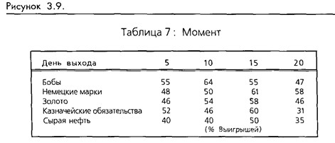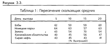 Все результаты тестирования, показанные в этом разделе, относятся к периоду с января 1986 до декабря 1990 (пять лет). Тесты использовали дневные открытия, пики, впадины и закрытия. Все вхождения производились на открытии дня, следующего за пересечением скользящих средних. Несмотря на то, что начальные остановки потерь являются формой выхода, здесь они только усложнят процесс, так что мы не использовали остановки контроля рисков в наших тестах. Проскальзывания и комиссионные мы установили равными нулю. Мы тестировали те же пять рынков, которые использовали в предыдущем разделе: немецкую марку, золото, соевые бобы, казначейские обязательства и сырую нефть. Те методы выхода, которые мы подобрали для тестирования, являются популярными и логичными стратегиями, и мы предположили, что они будут представлять интерес*для большинства трейдеров.