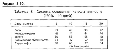 Вхождения нарынок происходят в течение дня на прорыве в любом направлении на р% от п-дневного среднего истинного диапазона (ATR – average true range). Этот тип вхождений был основой многих активно распространяемых торговых систем. Первая таблица (смотрите рисунки 3-10,3-11 и 3-12) показывает результаты 150-процентного прорыва среднего истинного диапазона последних 10 дней. Вторая таблица демонстрирует результаты 100-процентного прорыва ATR за последние 10 дней. Третья таблица представляет результаты 100-процентного прорыва ATR последних пяти дней.