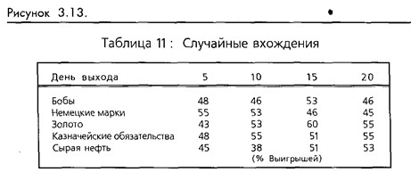 Мы могли бы продолжать до бесконечности, но думаем, что по крайней мере одна вещь прояснилась: не нужно применять изощренный анализ, чтобы понять, что ни один из вышеперечисленных методов вхождения не может существенно превзойти метод случайных вхождений. Для доказательства этого утверждения здесь приведены результаты тестов, использовавших генератор случайных чисел для принятия решения о покупке или продаже. Вхождения производились на открытии дня, следующего за выходо^из предыдущей позиции. Никакие технические исследования не применялись. (Смотрите рисунок 3-13.)