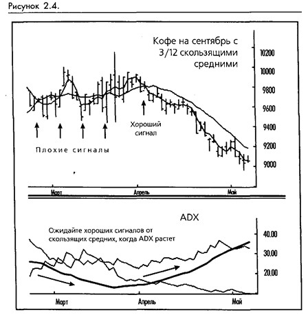 Из-за того, что покупка на впадинах и продажа на подъемах позволяет получать в лучшем случае очень скромный доход, многие трейдеры предпочитают торговать только в направлении основных трендов. В таком случае было бы лучше всего просто игнорировать сигналы следования за трендом во время падения ADX. Разумеется, в идеале хотелось бы иметь прибыльную контртрендовую стратегию в дополнение к стратегии следования за трендом и применять каждый из методов, согласуясь с направлением ADX. (Смотрите рисунок 2-7.)