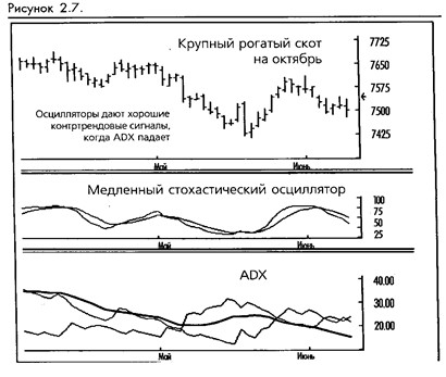 Падающий ADX свидетельствует о бестрендовом рынке, где следует использовать контртрендовую стратегию вместо методов следования за трендом. Осцилляторы перекупки или перепродажи, которые дают сигналы к покупке на впадинах и к продаже при росте, являются предпочтительными стратегиями в то время, когда рынок находится в таком торговом коридоре. Такие индикаторы, как стохастический осциллятор и RSI, должны давать правильные сигналы, когда цена колеблется внутри ограниченной области своего торгового диапазона.