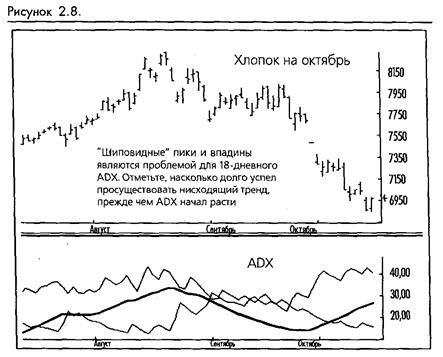 Мы бы оказали медвежью услугу, утверждая, что ADX решит все проблемы, с которыми только может столкнуться трейдер. У ADX есть и свои недостатки. Одна из проблем состоит в том, что на продолжительных периодах (мы предпочитаем 18 дней, как упоминали ранее), которые лучше всего применять на большинстве рынков, ADX вдруг неожиданно меняет направление, принимая форму шипа. Шипы обычно возникают на рыночных пиках, когда цены неожиданно переходят от сильного восходящего тренда к сильному нисходящему. Источником проблемы ADX является то, что он не может правильно распознать новый нисходящий тренд. ADX все еще будет включать в свои вычисления исторический период с сильным движением в положительном направлении, принимая в то же время данные нового периода с сильным движением в отрицательном направлении. В результате конфликта на входе, ADX будет падать некоторое время до тех пор, пока старое движение в положительном направлении не будет вытеснено из данных, и тогда ADX снова начнет расти из-за нового нисходящего тренда. На рынке, который произвел шип, ADX может не предупредить о тренде вовремя, что не позволит поймать большую часть быстрого нисходящего движения. (Смотрите рисунок 2-8.)
