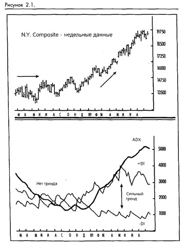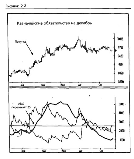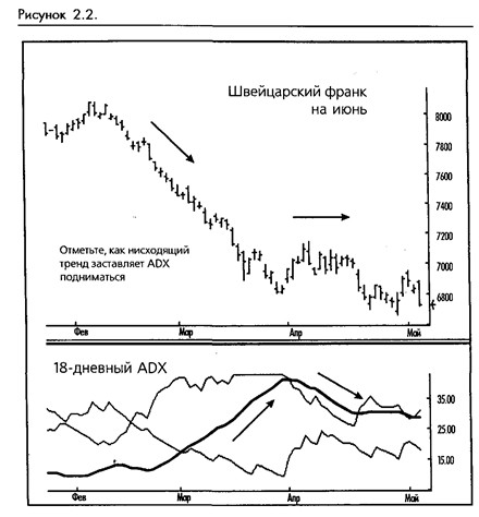 Некоторые технические аналитики придают большое значение уровню ADX как индикатору силы тренда, и они бы поспорили, что значение 28 свидетельствует о более сильном тренде, чем значение 20. Мы обнаружили, что направление ADX значительно более показательно, чем его абсолютное значение. Изменение вверх, например с 18 до 20, показывает более сильный тренд, чем отрицательное изменение с 30 до 28. Хорошее основное правило можно сформулировать следующим образом: пока ADX растет, любое значение ADX выше 15 свидетельствует о тренде. Мы рекомендуем вам ознакомиться с ADX и использовать его совместно с вашими любимыми техническими индикаторами. Вы скоро обнаружите определенные уровни растущего ADX, которые производят выдающиеся результаты с вашим любимым индикатором. Один индикатор хорошо работает, когда ADX поднимается за отметку 15, а другой – когда ADX растет выше 25. Когда ADX начинает уменьшаться на любом уровне, это свидетельство того, что рынок пошел в сторону и формирует боковой тренд. Мы исследуем значение растущего и падающего ADX более подробно и предложим подходящие торговые стратегии. (Смотрите рисунок 2-3.)