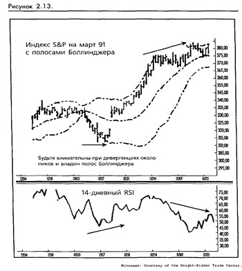 Полосы Боллинджера обычно используются наряду с другими техническими исследованиями для определения поворотов тренда на рынке ценных бумаг. Если цены близки к нижней границе и другое исследование подтверждает поворот, следовательно, должно быть безопасно покупать. Например, дивергенция RSI может использоваться для подтверждения дна в нижней части конверта. (Смотрите рисунок 2-13.)
