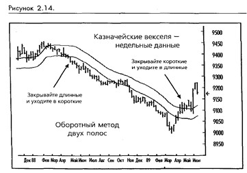 Достаточно недавними и уже популярными дополнениями к списку исследований каналов являются альфа-бета полосы, сейчас чаще называемы Полосы Боллин-джера (по имени Джона Боллинлжера, рыночного аналитика из CNBC/Financial News Network). Альфа-бета полосы и полосы Боллинджера являются статистически определяемыми полосами вокруг краткосрочной скользящей средней. Компьютерное программное обеспечение сначала вычисляет простую скользящую среднюю, а затем считает скользящее стандартное отклонение от средней. (Смотрите рисунок 2-12.)