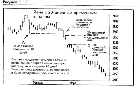 Первый график (на рисунке 2-21) – по японской йене. В дополнение к последовательности торговых сигналов следует отметить две другие особенности этого графи ка.