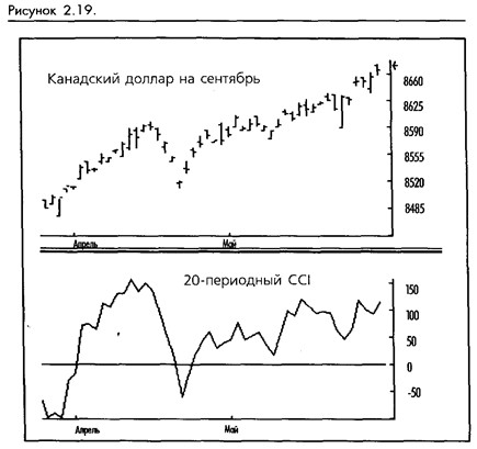 На компьютерном экране CCI обычно отображается как осциллятор или гистограмма, которая колеблется в разных направлениях около нулевой отметки. Так как индекс измеряет насколько далеко цены отошли от скользящей средней, CCI позволяет нам измерять силу тренда. В теории, чем больше значение CCI, тем сильнее тренд и тем более прибыльна должна быть торговля в направлении тренда. (Смотрите рисунок 2-19.)