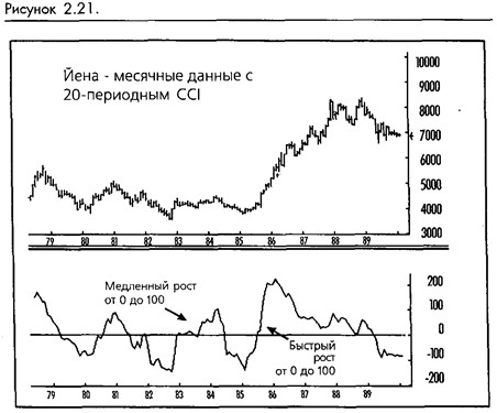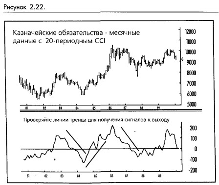 Во-первых, чем быстрее рост CCI от 0 до 100, тем сильнее и определенней обнаруженный им тренд. Во-вторых, быстрое падение CCI после выхода за 100 обычно означает, что тренд теряет силу и что доходы должны быть защищены включением остановок на этой точке. На графике казначейских обязательств (смотрите рисунок 2-22) следует отметить использование трендовых линий CCI для ранних выходов.