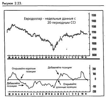 Как мы упоминали ранее, Ламберт проводил исследования, которые свидетельствовали, что длина периода CCI должна быть установлена на величину менее одной трети длины цикла. Он протестировал некоторое количество разных длин периодов, заканчивая числом 20 как стандартным, но предложил, чтобы это число подбиралось для каждого рынка в отдельности. (Мы не оспариваем, что длина периода должна устанавливаться таким образом, чтобы удовлетворять историческим данным.) Двадцать является величиной, используемой по умолчанию для CCI большинством программ.