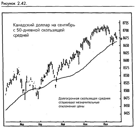 Набор, представляющий большое количество прошлых данных, создаст гладкую линию. Например, график показывает 50-дневную скользящую среднюю. (Смотрите рисунок 2-42.) Как видите, большую часть времени цены находятся по одну или другую сторону от скользящей средней. Также, когда тренд развивается, скользящая средняя приобретает наклон в направлении тренда, показывая нам его силу.