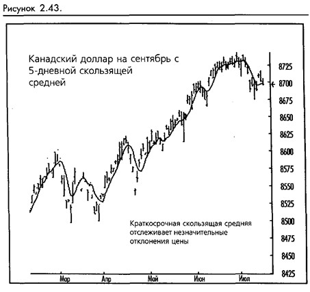 Более долгосрочные скользящие средние сгладят все второстепенные флуктуации и покажут только более долгосрочные тренды. Краткосрочные скользящие средние покажут более краткосрочные тренды в ущерб долгосрочным. Уменьшенный набор данных, представляющий только более свежие данные, создаст более чувствительную линию. График, показывающий 5-дневную скользящую среднюю, перекрывает тот же график для 50-дневной средней, 5-дневная отражает данные значительно точнее, следуя за каждым небольшим изменением цены. Краткосрочные тренды просто увидеть, а тренды, которые стали очевидны благодаря 50-дневной средней, значительно сложнее определить. (Смотрите рисунок 2-43.)