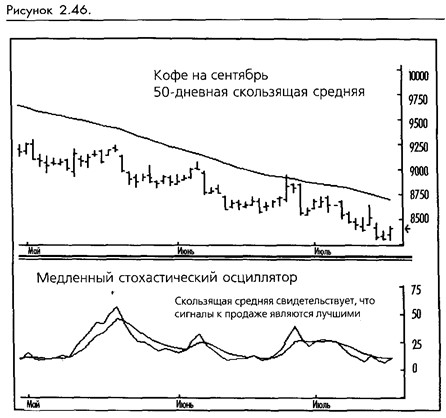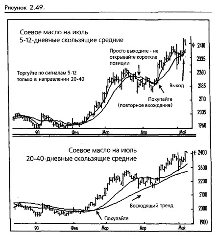 Торговля против тренда отсеивается по определению. При наличии восходящего тренда, определяемого долгосрочным осциллятором, по сигналу краткосрочных пересечений будут применяться только длинные торги. И наоборот, будут приниматься только короткие торги при нисходящем тренде. Будут встречаться нейтральные периоды во время коррекций тренда и боковых движений рынка, когда краткосрочные и долгосрочные скользящие средние не смогут подтвердить направление. Дергания не будут полностью уничтожены, однако их число значительно понизится. (Смотрите рисунок 2-49.)