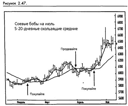 Наиболее популярные системы скользящих средних используют две скользящие средние. Они обычно состоят из более продолжительной средней, которая служит для определения тренда, и более краткосрочной средней, которая дает торговые сигналы на пересечении с более долгосрочной средней. Наиболее известная из таких систем – 5-дневная/20-дневная система Ричарда Дончиана, которая, между прочим, не является простой оборотной системой, а использует тщательно продуманный набор фильтров. (Смотрите рисунок 2-47.)
