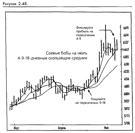 Нам нравятся системы тройных скользящих средних, потому что они предоставляют преимущество нейтральной зоны в противоположность непрерывной оборотной торговле, генерируемой методами одиночной или двойных скользящих средних. Например, в системе 4-9-18, когда 4 пересекает 9, мы выходим из нашей позиции и не входим в новую, пока 9 не пересечет 18. Нам также нравятся тройные системы потому, что пересечение 4 и 9 является механизмом быстрого получения доходов, который решает некоторые проблемы, связанные с возвращением слишком большой части дохода, о которых мы упоминали ранее. Мы считаем, что в хорошей торговой системе выходы должны всегда быть быстрее вхождений. Вхождения должны быть медленными и избирательными, возможно требующими неординарного события для вхождений в торговлю. Выходы должны быть достаточно медленными для того, чтобы позволять доходам течь, однако достаточно быстрыми, чтобы в конечном счете зафиксировать основную часть потенциальной прибыли. (Смотрите рисунок 2-48.)
