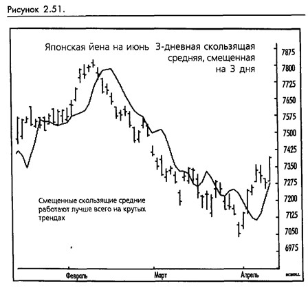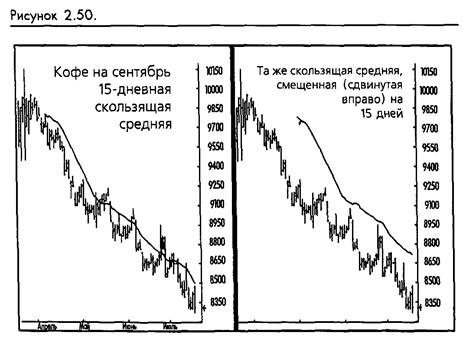 Одной из проблем, характерных для скользящих средних, как и для любых других следующих за трендом исследований подобного рода, является их неспособность близко прижаться к тренду, сохраняя одновременно желаемый сглаживающий эффект. Как мы говорили, медленные скользящие средние хорошо сглаживают, однако всегда находятся на удалении от рынка в то время, как быстрые скользящие средние излишне чувствительны. Смещенные скользящие средние помогают исправить этот дефект. Они создаются путем обычного вычисления скользящей средней и проецирования ее на будущее при помощи смещения на заданное количество дней. Как вы можете видеть на прилагаемом графике (смотрите рисунок 2-50), эффект заключается в перемещении скользящей средней вперед по времени. Для того, чтобы увидеть, как выглядят смещенные скользящие средние, если ваше программное обеспечение не предоставляет таких возможностей (DMA уже давно известны, ноне слишком распространены), нарисуйте два графика: один с ценами, а другой со скользящей средней, затем положите один на другой и рассмотрите их на просвет. Сместите скользящую среднюю вправо. Вы увидите результат смещения скользящей средней вперед по времени.