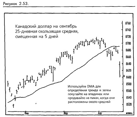 Наиболее общее встреченное нами применение DMA заключается в использовании их в качестве краткосрочного индикатора тренда. Джо ДиНаполи, например, торгует на разворотах внутри тренда, определяемого DMA. (Смотрите рисунок 2-53.)