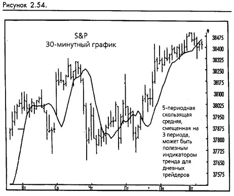 Другие дневные трейдеры предпочитают использовать их для принятия решения, какой стороны рынка придерживаться в течение дня. Например, во фьючерсные торги на SP можно входить только в направлении DMA, вычисляемой на 30 или 60-минутных периодах, используя некий другой, более чувствительный метод для реального вхождения и выхода с рынка. (Смотрите рисунок 2-54.)