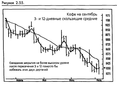 Фильтрование сигналов по ценам обычно означает оттягивание вхождения в торговлю до того момента, когда цена удовлетворит некоторому дополнительному критерию. Это может быть определено путем измерения величины прорыва за скользящую среднюю или измерением расстояния, на котором оказалась одна скользящая средняя от другой после пересечения. Трейдер в этом случае ищет подтверждение того, что пересечение скользящей средней не было случайным ценовым событием, а на самом деле является изменением тренда. Новая торговля не начинается до тех пор, пока цена не будет превосходить скользящую среднюю на некое минимальное значение. Другим вариантом этого фильтра будет ожидание, когда цены поднимутся на некий процент относительно скользящей средней. Следующая возможность (которую мы находим общепринятой) заключается в выжидании заданного периода после пересечения, пока рынок не достигнет нового пика или впадины за последние п дней, что является прорывом канала. (Смотрите рисунок 2-55.) Один из наших любимых фильтров или методов подтверждения очень прост: дождитесь закрытия в направлении нового тренда.
