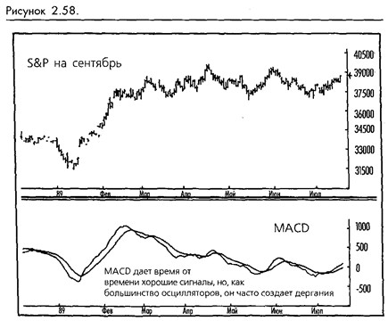 Основным сигналом MACD является пересечение. Сигналы к покупке генерируются, когда более быстрая линия пересекает снизу более медленную, а сигналы к продаже – в противоположном случае. Мы хотим вас сразу предостеречь: на большинстве рынков механическая торговля на каждом пересечении MACD даст в результате частые дергания и значительные потери. Вы быстро обнаружите, что узкие торговые диапазоны разрушительно действуют на индикатор, дающий много ложных сигналов и собирающий потери. К счастью, существуют дополнительные интерпретации MACD, которые помогут трейдеру избежать дерганий и прочих недостатков. (Смотрите рисунок 2-58.)