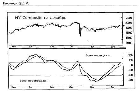 Метод MACD может быть использован для определения точек, на которых рынок становится перекупленным или перепроданным и, таким образом, оказывается подверженным развороту. Рассматривая более быструю из двух линий MACD, Аппель установил области перекупки/перепродажи для индекса SP на уровне +/-2.50 по шкале MACD. Для индекса NYSE он рекомендует +/-1.20. Когда другая линия достигла этих критических областей, любое пересечение генерирует сигнал к покупке или продаже. Пересечения, которые возникают до достижения уровня экстремума, могут быть проигнорированы, и, таким образом, будет удалено большинство дерганий. В результате небольшого исследования, подобные уровни могут быть обнаружены для любого рынка, находящегося в широком торговом диапазоне с большими движениями цены. Помните, MACD лучше всего использовать в качестве долгосрочного инструмента следования за трендом, а не краткосрочного торгового таймера. Сигналы, возникающие в средней области графика MACD, следует принимать, только если другой проверенный индикатор подтверждает, что торговля будет проходить в направлении тренда. (Смотрите рисунок 2-59.)