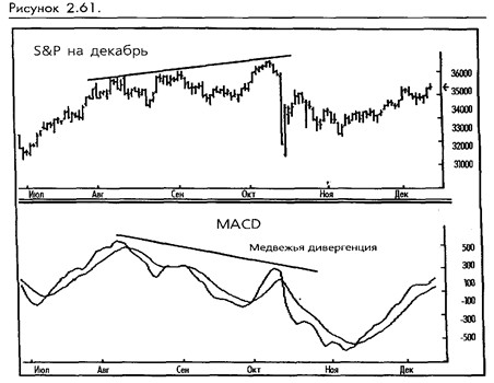 С нашей точки зрения, наиболее ценными и показательными моделями MACD являются дивергенции, особенно на нетрендовытс рынках. Существуют двухуровневые конструкции, которые возникают, когда рынок производит пик или впадину, а затем последовательно новый пик или впадину, которую MACD не может подтвердить. (Смотрите рисунок 2-60.) Дивергенции – это очень эффективная форма большинства технических исследований, и MACD здесь не является исключением. Дивергенции MACD более полезны для индикации продолжения тренда после коррекции, чем в качестве сигналов поворота тренда.