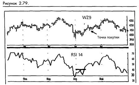 Первой из этих формаций является ложное колебание, которое проще наблюдать на исследовании собственно RSI, нежели на низлежащем графике. Ложное колебание состоит из шипа, образованного RSI, выступающего за отметку 70 и следующего за ним нового шипа с более низким пиком, чем у первого. Реальный сигнал к продаже производится, когда преодолевается нижняя точка между шипами RSI. Сигналом к покупке будет обратная схема с двумя направленными вниз шипами и последующим преодолением высшей точки между ними в верхнем направлении. (Смотрите рисунок 2-79.)