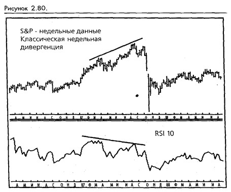 Мы считаем, что наиболее значительные и мощные сигналы RSI возникают в форме дивергенции между структурой индекса и структурой низлежащего графика. Мы нашли эти дивергенции особенно полезными при обнаружении основных долгосрочных пиков и впадин на недельных графиках. Например, взгляните на недельный график SP, ведущий к пику августа 1987. (Смотрите рисунок 2-80.)