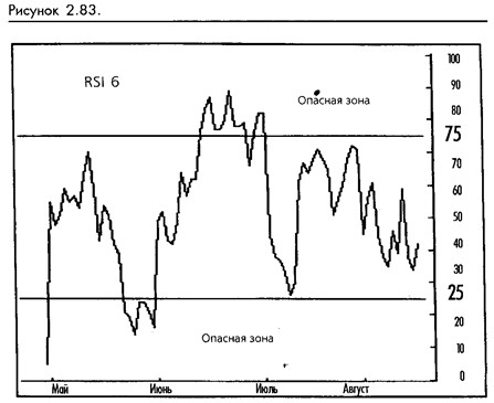 Фильтр RSI предлагает прекрасное решение этой общей проблемы. Если значение RSI выше 75 (если вы покупаете) или ниже 25 (если вы продаете), тогда отложите ваше вхождение. Входите только тогда, когда RSI вернется обратно на уровень между 75 и 25. Обязательно будут происходить незначительные рыночные коррекции, и ваше вхождение не будет приходиться на уровни перекупки или перепродажи. (Смотрите рисунок 2-83.)