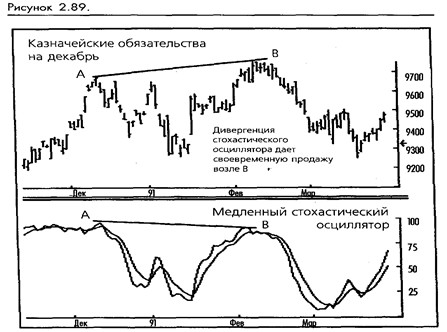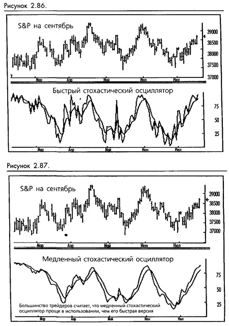 Быстрые %К и %D, снова сглаженные трехдневной скользящей средней, дают медленный стохастический осциллятор, который используется чаще. (Смотрите рисунок 2-87.) *