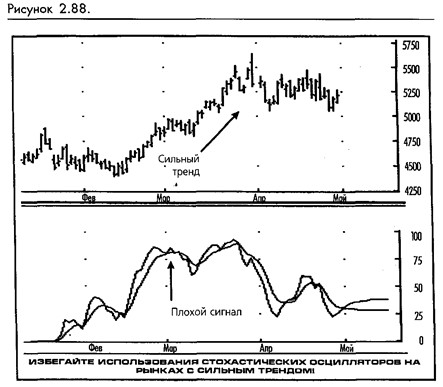 Стохастические осцилляторы работают лучше всего на широких ценовых диапазонах или на мягких трендах с легким уклоном вверх или вниз. Худшим рынком для нормального использования стохастических осцилляторов является рынок, находящийся в устойчивом тренде и подверженный лишь незначительным коррекциям. На таком рынке стохастические осцилляторы будут производить множество кон-тртрендовых точек вхождения, которые будут быстро обескровлены трендом. Если вы будете продолжать использовать стандартные методы торговли со стохастическими осцилляторами, вы получите серьезную полосу потерь. Помните: трейдер, который придумал пословицу «тренд – это твой друг» («the trend is your friend»), не пользовался стохастическими осцилляторами. (В качестве примера потерь при использовании стохастических осцилляторов смотрите рисунок 2-88.)