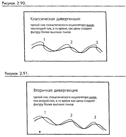 Если рынок не ведет себя так, как от него ожидают*, мы можем столкнуться с "моделью вторичной дивергенции" вроде той, что показана на рисунке 2-91. В этой модели цены также совершают три рывка к вершине, но стохастический осциллятор производит три нисходящих пика, которые и создают дивергенцию. В этой "вторичной" модели, в отличие от классической, точка 3 ниже точки 2. Мы обнаружили, что такие модели дивергенции дают значительно лучшие результаты, чем классические сигналы. Это справедливо для большинства осцилляторов. Мы с удовольствием были бы более точными и определенными в отношении результатов дивергенции, но их чрезвычайно сложно объективно тестировать.