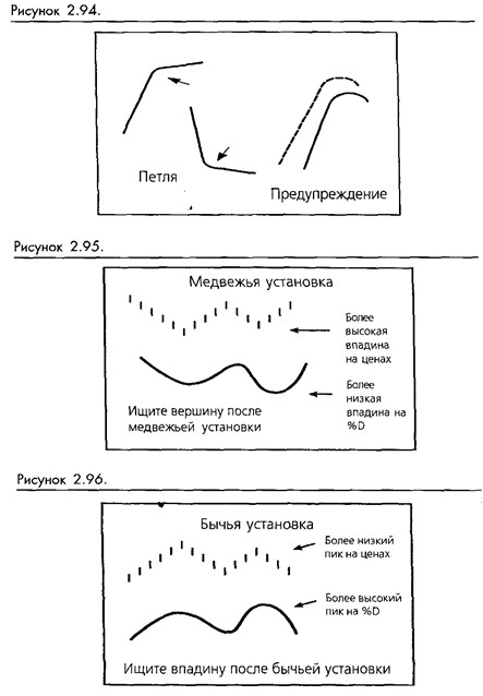Бычьи установки возникают, когда цены падают и производят серии понижающихся впадин и понижающихся вершин. Стохастический осциллятор дает дивергенцию и создает схему повышающихся пиков в то время, как цены продолжают падать. Эта установка указывает на то, что цены в скором времени создадут важную впадину. (Смотрите рисунок 2-96.)
