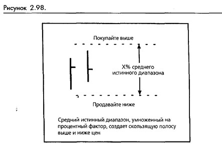 Как вы могли догадаться, системы прорыва, основанные на волатильности, представляют собой оборотные системы, всегда присутствующие на рынке. Каждый день после закрытия вычисляйте ATR и затем умножайте его на процент движения, необходимый для запуска торговли. Прибавьте результат к цене закрытия, и вы получите точку, на которой на следующий день будет запущена покупка. Вычтите результат из цены закрытия, и вы получите точку, на которой будет запущена продажа. Установите оба приказа на следующий день, и вы снова готовы к работе. (Смотрите рисунок 2-98.)