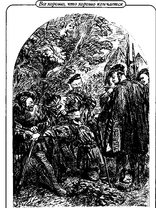 пришлет ему кольцо, когда с ней случится какое-нибудь ужасное несчастье. На вопрос короля, каким ‘ образом ему досталось это кольцо, Бертрам выдумал историю, что он получил это кольцо от одной женщины через окошко, и прибавил, что не видался с Еленой ни разу с самого дня разлуки. Король, зная, что Бертрам не любил своей жены, заподозрил, что он -убил ее, и велел страже схватить преступника.