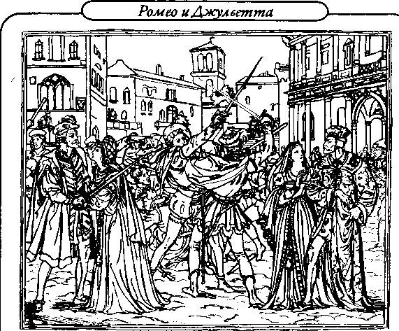 В тот же день около полудня друзья Ромео, Бенволио и Меркуцио, гуляя по улицам Вероны, встретились с отрядом сторонников Капулетти с запальчивым Тибальдо во главе, с тем самым Ти-бальдо, который чуть не сразился с Ромео на балу у старого синьора Капулетти. Увидя Меркуцио, Тибальдо стал обвинять его в сообщничестве с Ромео. Меркуцио был молод и вспыльчив, как и