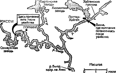 На полках с книгами я нашёл карту района, и мы с нетерпением стали изучать течение реки Бьюр. Найдя соответствующий отрезок реки, Финбоу тут же перерисовал его на листок бумаги.