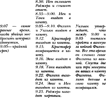 – Вот примерно в такой последовательности всё происходило, верно? – спросил Финбоу. – Мой график основан на сведениях, полученных Берреллом, и на твоём рассказе. Ручаться, что он составлен с точностью до одной минуты, нельзя, но тем не менее общее представление он даёт.