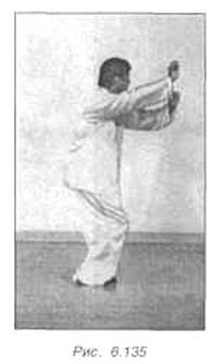 Слегка разверните корпус вправо, лицом на восток. Правой рукой поднимите меч выше головы. Удерживайте оружие горизонтально острием на север. Левая рука движется за правой, так что левый цзяньцзюэ продолжает касаться правого запястья (рис. 6.135).