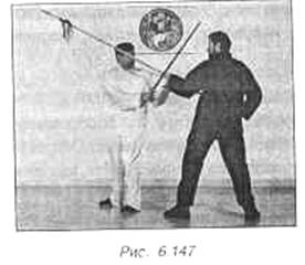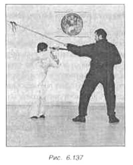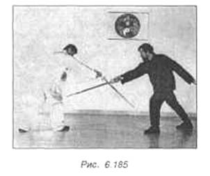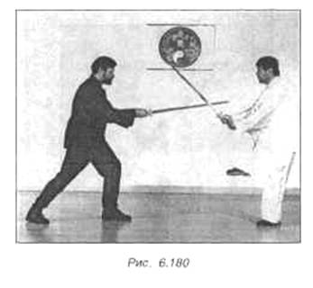 Выполняя движение, можно продолжать осуществлять давление на оружие противника и контратаковать его острием меча (рис. 6.182). Базовыми техниками являются я (давление вниз) и цы (нанесение колющего удара).