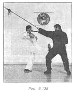 Если противник пытается нанести удар по голове сверху, сократите дистанцию, блокируйте атаку мечом (рис. 6.137) и одновременно нанесите удар ногой (рис. 6.138). Базовой техникой является шаньцзиэ.