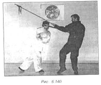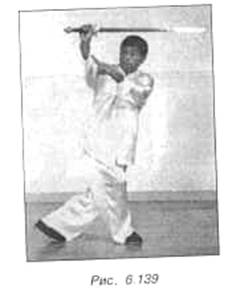Продолжая предыдущее движение, отведите меч назад режущим приемом, в то время как ваш корпус движется вперед (рис. 6.140). Базовой техникой является чоу.