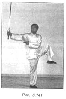 Выпрямите корпус и правую ногу. Поднимите левое колено вверх, так чтобы коленная чашечка указывала на восток. Одновременно опустите правую руку с мечом вниз, удерживая меч в вертикальном положении острием вверх (рис. 6.141).