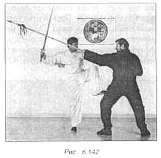 Если противник атакует справа, вы можете предупредить его, блокируя его оружие мечом или ударом в предплечье, а затем нанесите удар сверху левой рукой. Можете также нанести удар левой ногой (рис. 6.142). Базовой техникой является цэцзиэ.
