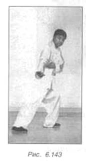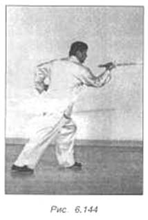 Не останавливаясь, поверните голову лицом на северо-восток. Сместите вес тела на левую ногу и на носке разверните правую так, чтобы носки обеих ног указывали на восток. Вы примете левую стойку лучника. Одновременно разверните корпус влево и отведите руки к левому боку. Левый цзяньцзюэ находится на уровне пояса ладонью вверх. Правая рука удерживает меч хваткой иньба, ладонью вверх. Описав мечом дугу вниз, вперед и вверх, направьте его перед собой на восток. Меч удерживается в горизонтальном положении, а лезвие развернуто вертикально (рис. 6.144).