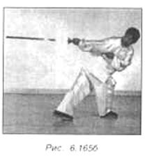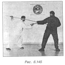Если противник использует длинное оружие (копье или посох) и атакует спереди, блокируйте его левой рукой и контратакуйте рубящим движением меча (рис. 6.164). Базовой техникой является пи.