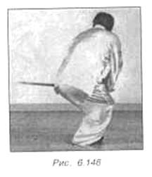 Слегка разверните корпус вправо. Сделайте шаг вперед левой ногой и поставьте ее рядом с правой. Опустите корпус и сомкните стопы. Одновременно, удерживая меч правой рукой, отведите его вниз к левому колену. Левый цзяньцзюэ продолжает соприкасаться с правым запястьем. Удерживая меч в горизонтальной плоскости, направьте его за спину, острием за запад (рис. 6.148).
