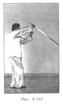 Продолжая предыдущее движение, поднимите правую руку перед собой выше головы, так чтобы острие меча находилось на уровне груди и было направлено вниз по диагонали. Одновременно слегка распрямите корпус и сместите вес тела на левую ногу (рис. 6.152).