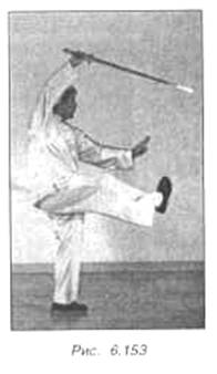 Опустите левый цзяньцзюэ и направьте его на острие меча. При этом поднимите правые колено и носок. Так вы примете стойку на одной ноге. Слегка согните левую ногу и держите корпус прямо (рис. 6.153).